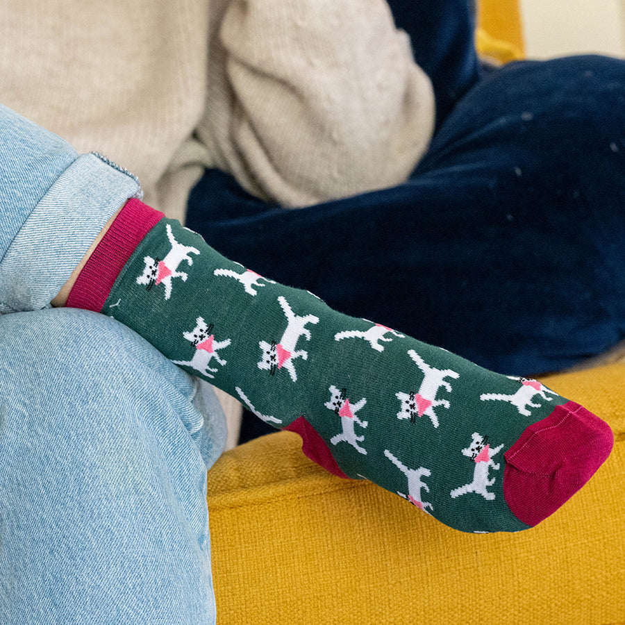 Burgundy and green organic cotton and recycled yarn mix ankle socks with cute cat pattern