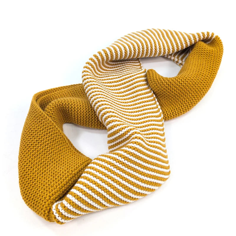 The Pandji Snood Mustard makes a statement with its dual-tone charm. Flip between classic stripes and solid colour to match your mood or your coat.