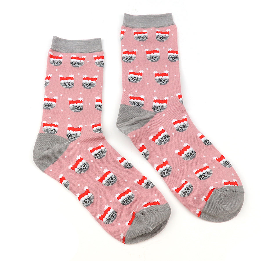 Denim blue and magenta organic cotton and recycled yarn mix ankle socks with cute Christmas cat pattern