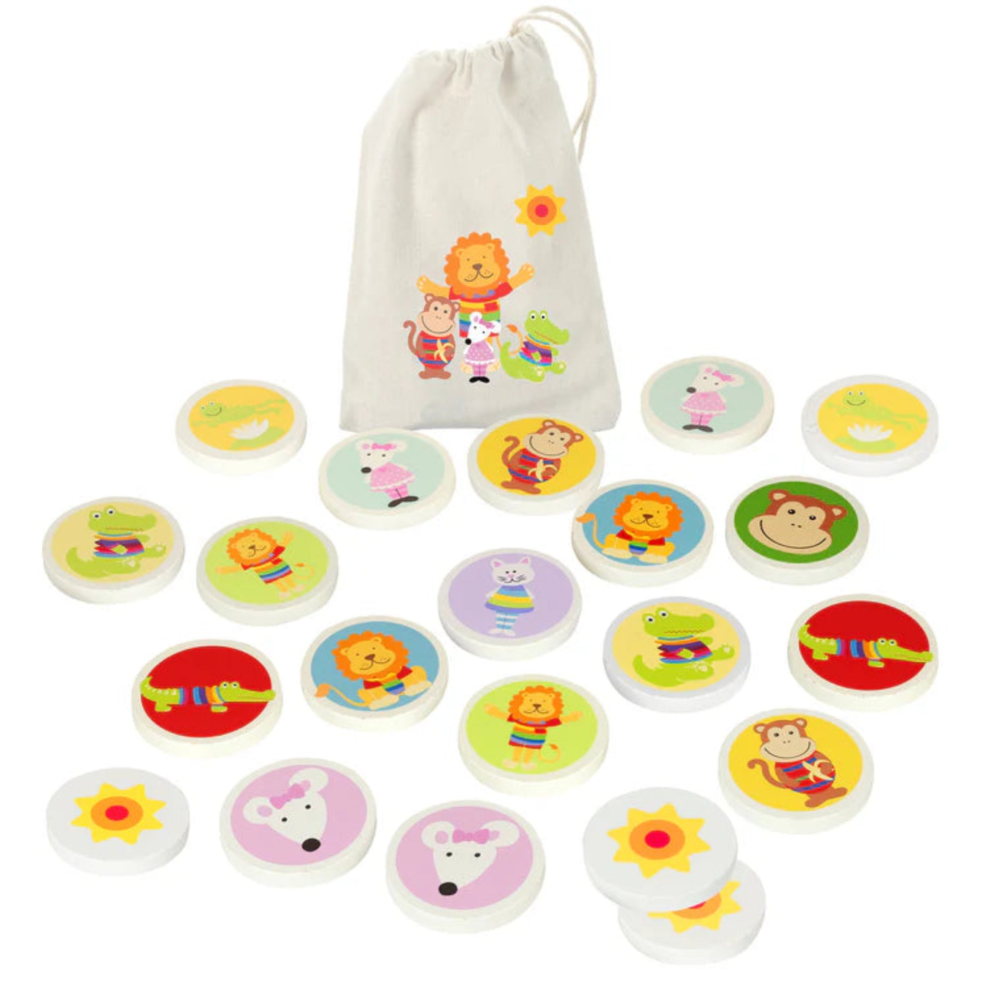 A beautiful version of a memory game. A cavas bag of wooden pieces each with beautiful illustrations printed on. Turn over each piece and try to find the ones that match! The set comes with a handy drawstring bag for conveniently storing the pieces..
