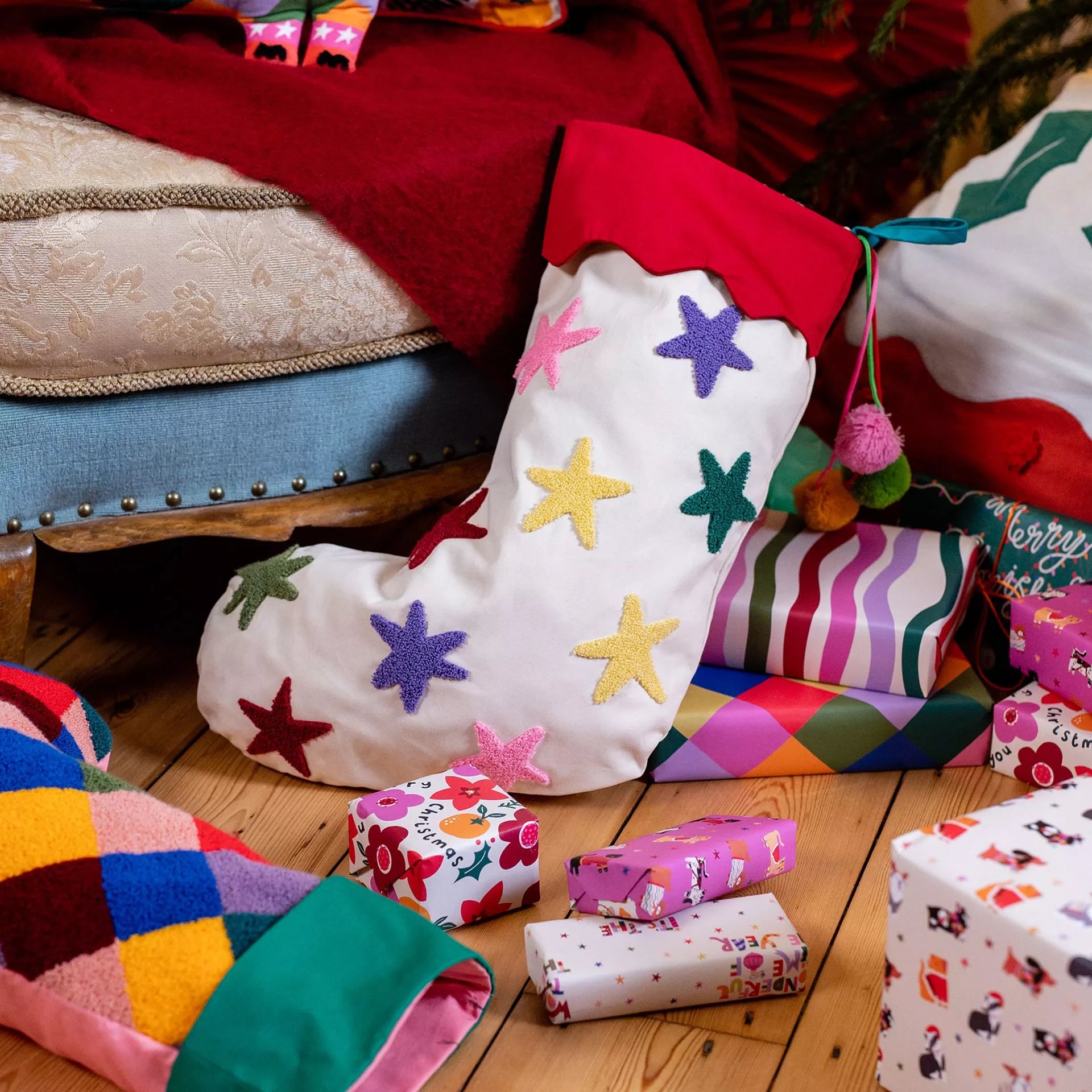 End of bed or around the Christmas tree? Either way, make a statement when you put out this stocking, it’s a feast for the eyes, designed by Raspberry Blossom® Exclusively available, this stocking is embroidered with tufted stars, has a decorative scalloped top and measures a substantial 63cm long. Comes with hook at the top, and finished with 3 colourful pompoms. Designed in collaboration with Raspberry blossom we bring you a joyful branded collection of homeware and decorative gifts, inspired by the illustrations from this award-winning greeting card brand.