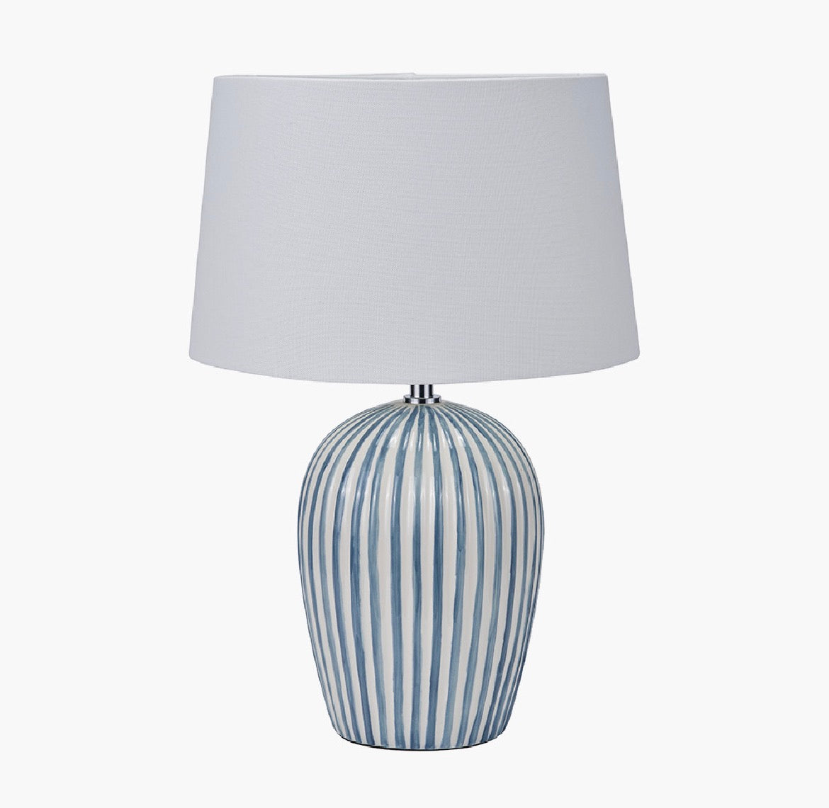 This ceramic table lamp features a curved shaped base, with a delicate blue and white stripe design, perfect for adding a hint of colour to your interior. Topped with a self-lined white cotton effect shade, this table lamp will add a touch of style to your home.