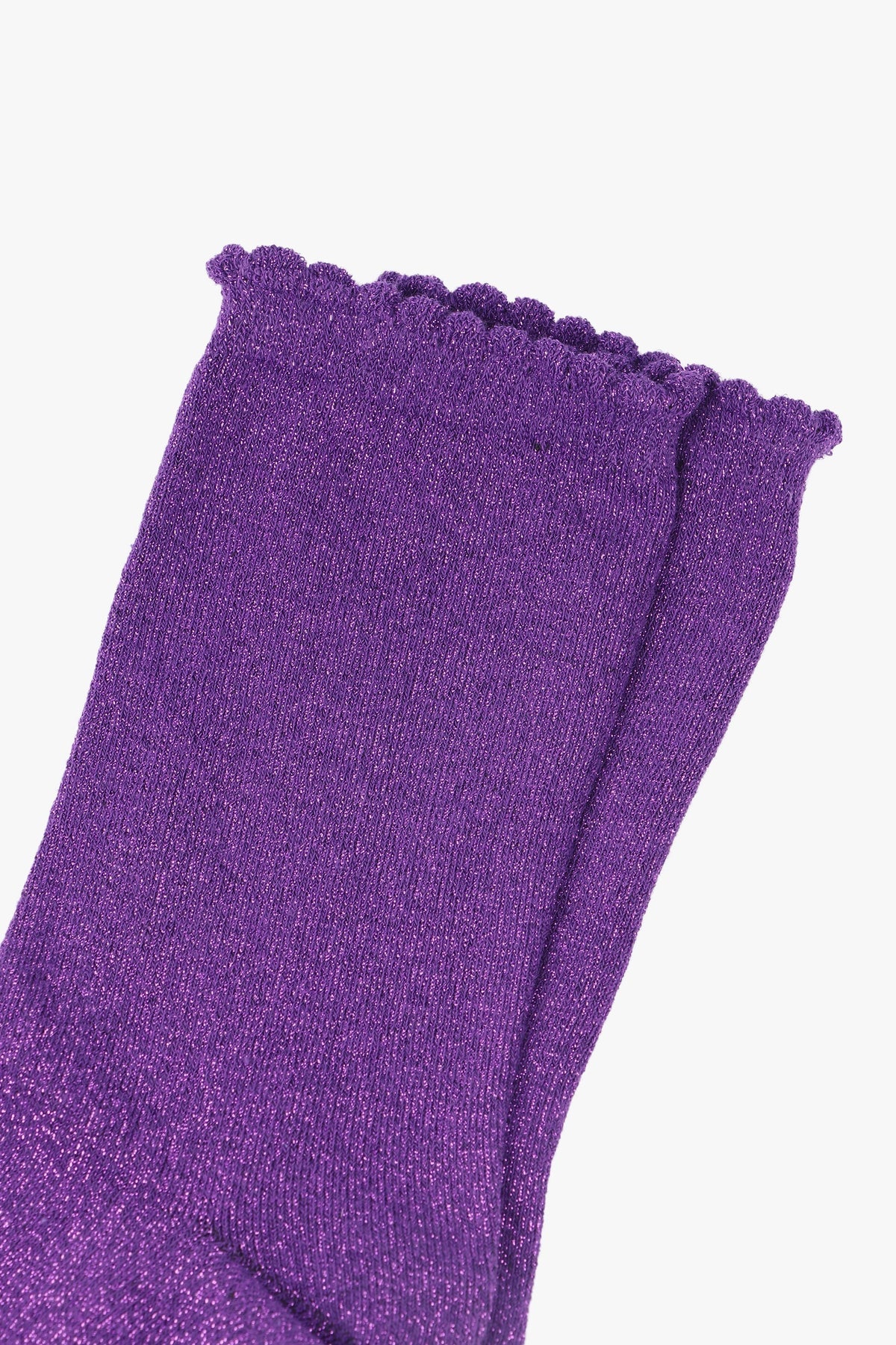 Designed in the UK, these glitter socks are crafted from soft blended cotton. Bold purple socks with an eye-catching silver sparkle. Naturally breathable with a luxuriously comfortable scalloped cuff.