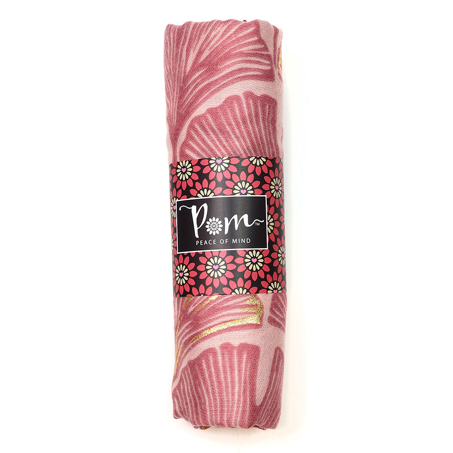 Soft blush scarf with pink ginkgo leaf print, red leafy border and metallic gold detailing