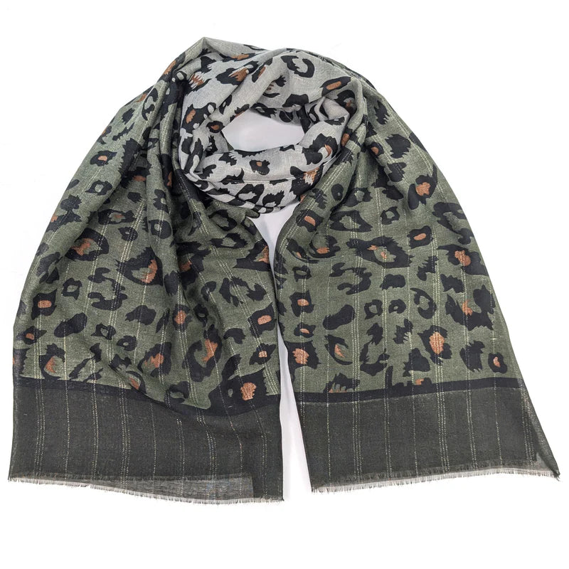 This green glittery leopard print scarf blends classic pattern with seasonal tones and a hint of sparkle — perfect for dressing up everyday looks.