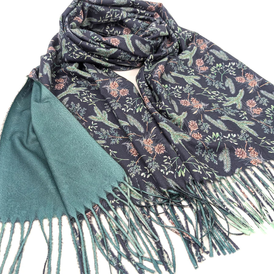 Wrap up in seasonal style with the Fir Cone Pashmina Style Scarf. Featuring a beautifully detailed fir cone and foliage print on a deep blue base, this scarf brings cosy woodland vibes to your winter wardrobe. The plain green reverse and matching tassels add a touch of sophistication while keeping you snug and stylish.