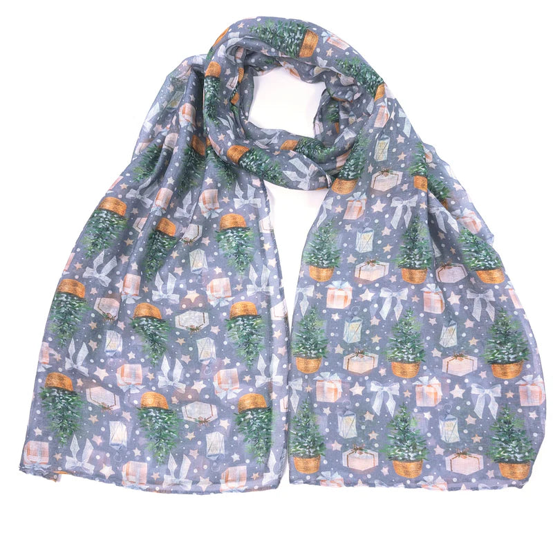 The Grey Lanterns Scarf captures the magic of Christmas with its cosy design of festive trees, glowing lanterns and beautifully wrapped gifts. Set on a soft grey background, this exclusive print adds a twinkle of charm to any winter outfit. Lightweight and elegant, its your perfect accessory for Christmas markets, parties or thoughtful gifting.