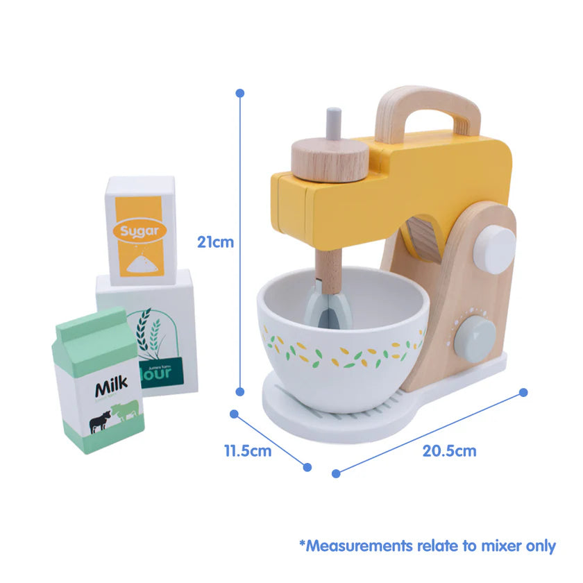 This enchanting wooden food mixer set includes, milk, flour and sugar – perfect to fuel the imagination of your mini baker.